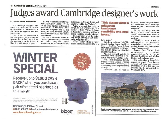 A Cambridge designer who brought a little bit of Central Otago to Waikato has stormed to the top of the region's architecture awards.