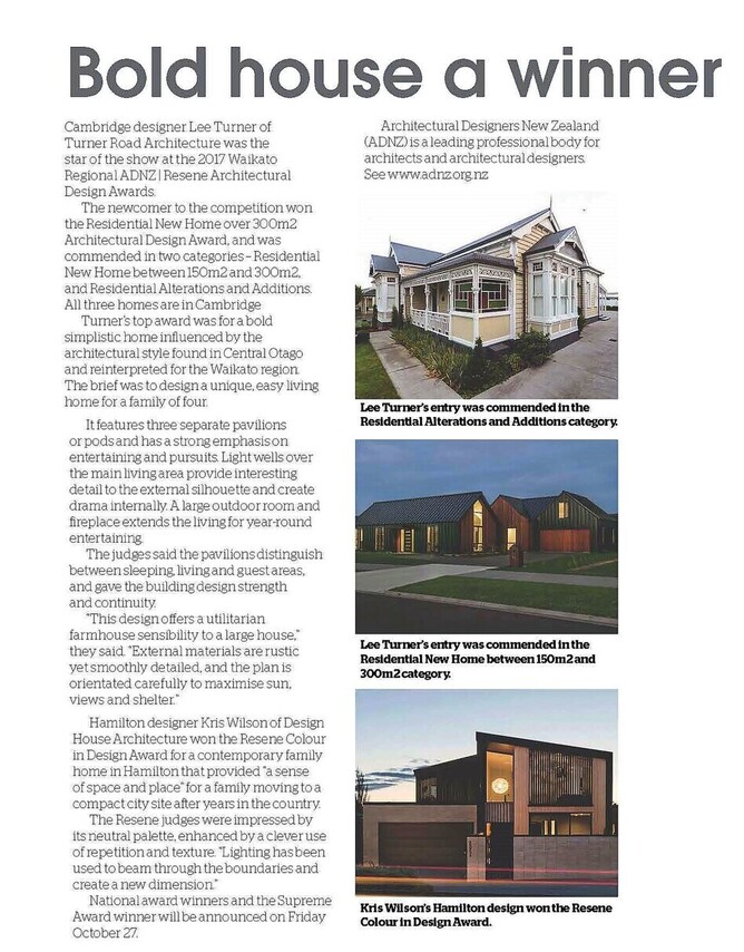 Cambridge designer Lee Turner of Turner Road Architecture was the star of the show at the 2017 Waikato Regional ADNZ | Resene Architectural Design Awards.
