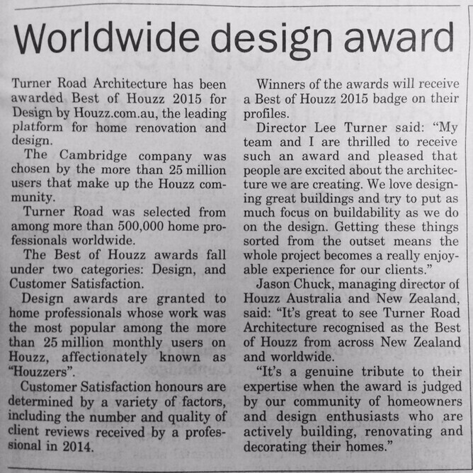 Turner Road Architecture has been awarded Best of Houzz 2015 for Design by Houzz.com.au, the leading platform for home renovation and design. The Cambridge company was chosen by the more than 25 million users that make op the Houzz community. Read more below..