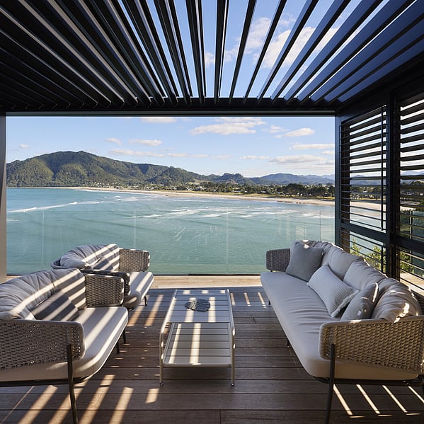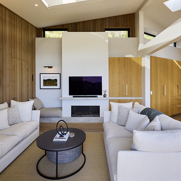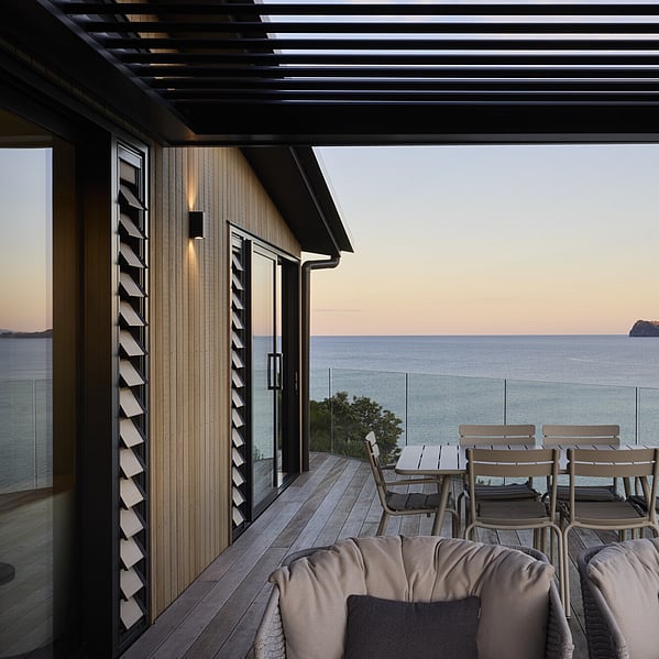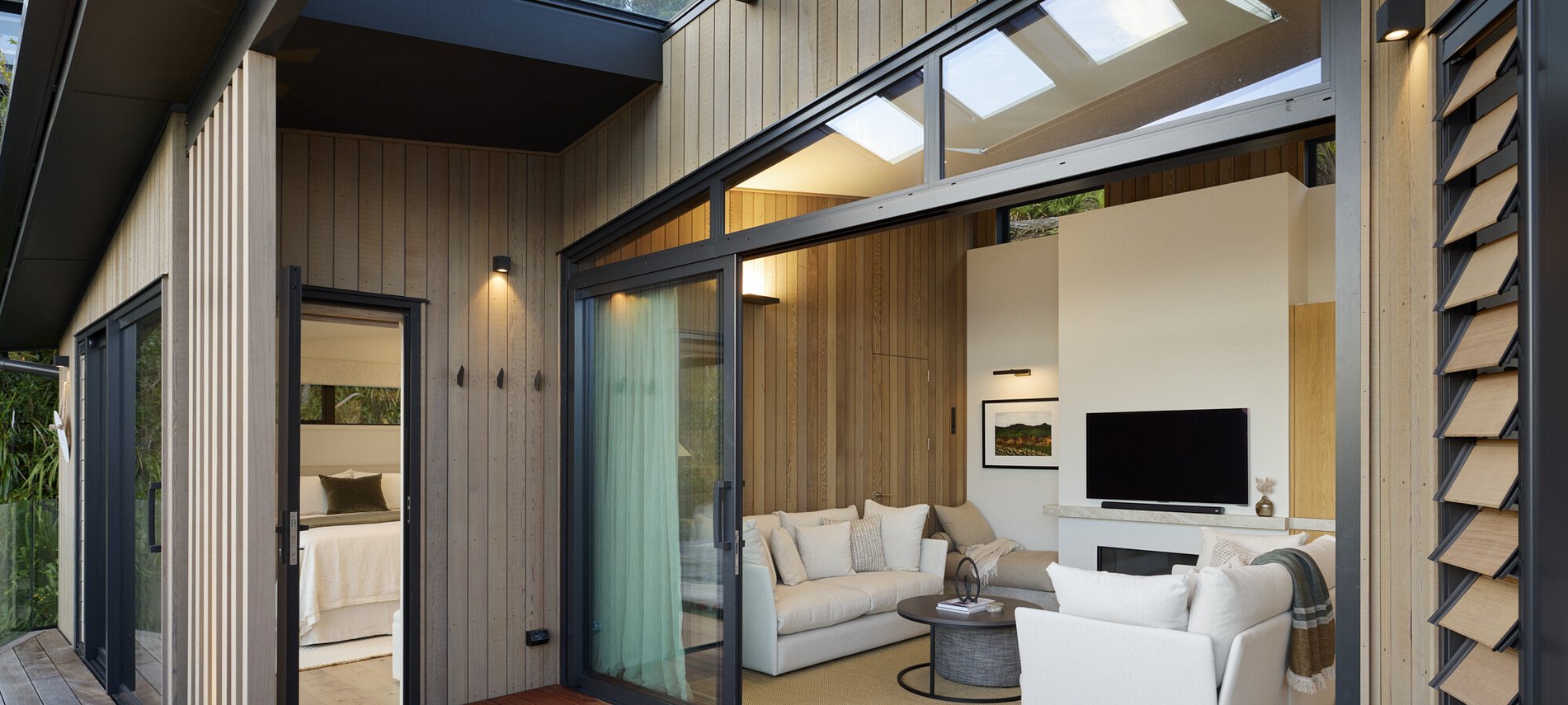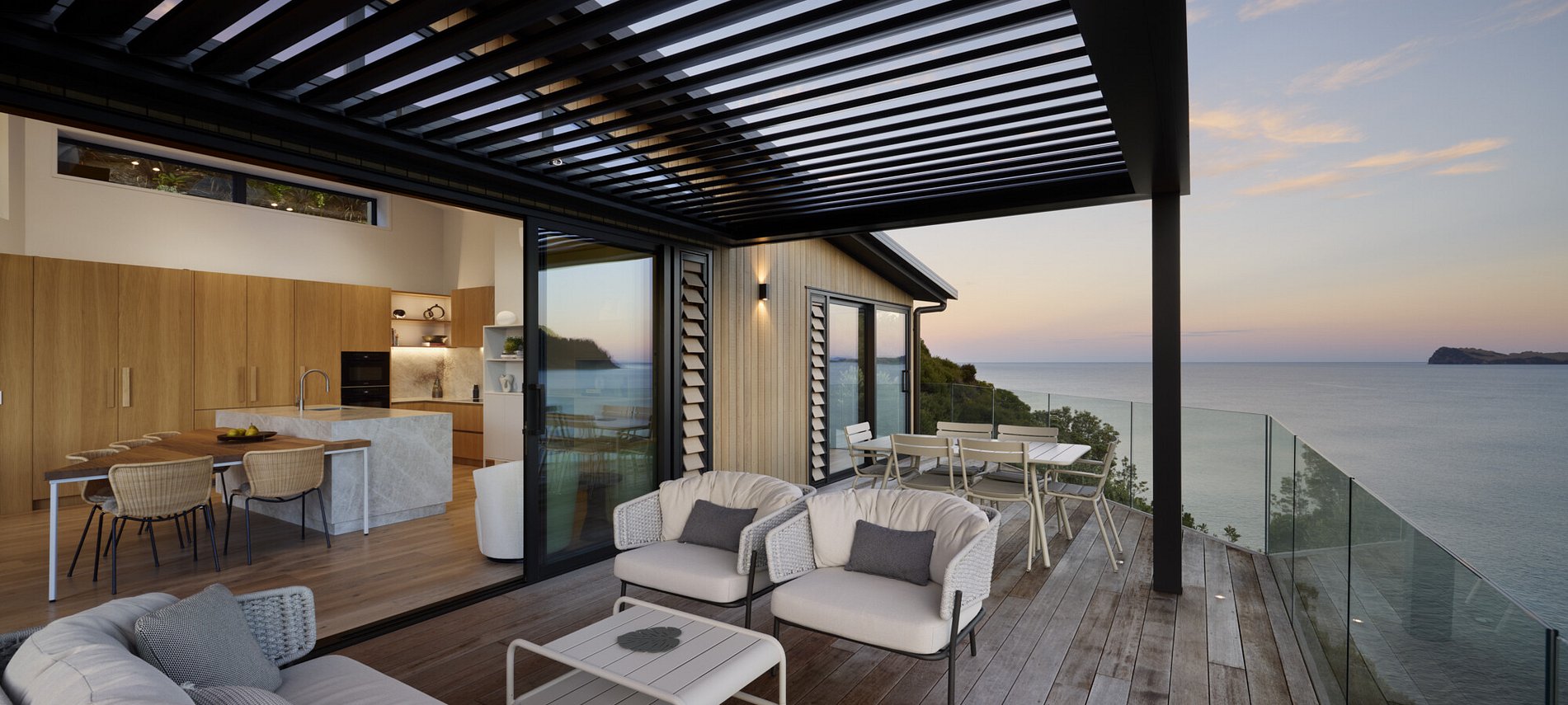 At the heart of the home, the open-plan kitchen, dining, and lounge flow effortlessly to the main deck. An adjustable louvered roof and wall system provide shelter from the elements, while large sliding doors bring the outdoors in. The lounge boasts a cosy book nook, built-in storage, and a striking roof window that floods the space with natural light.