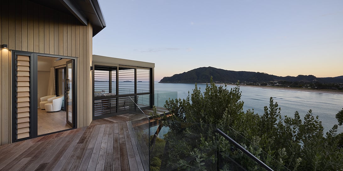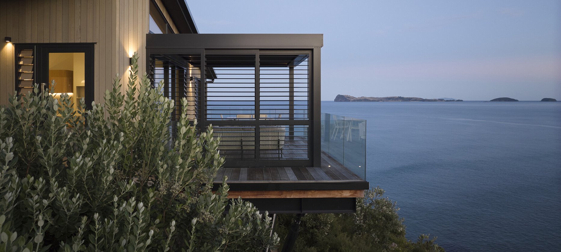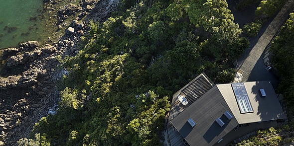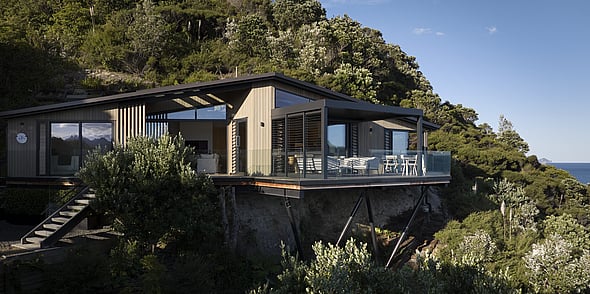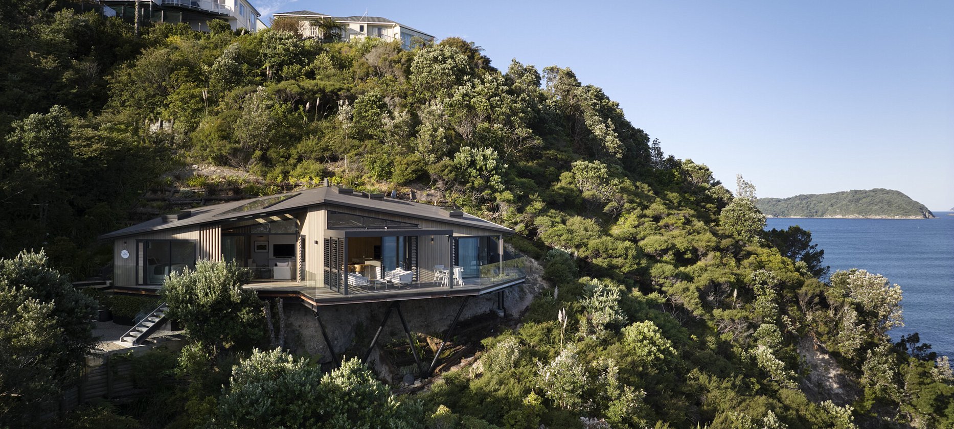 Nestled on the slopes of Mount Paku, Cliff Hanger House captures sweeping views of Tairua Harbour and Slipper Island, appearing to hover above the rugged coastline 35 metres below. Its organic design mirrors the mountain’s natural contours, with a roof that tilts and folds to subtly integrate with the landscape.
