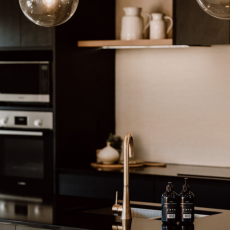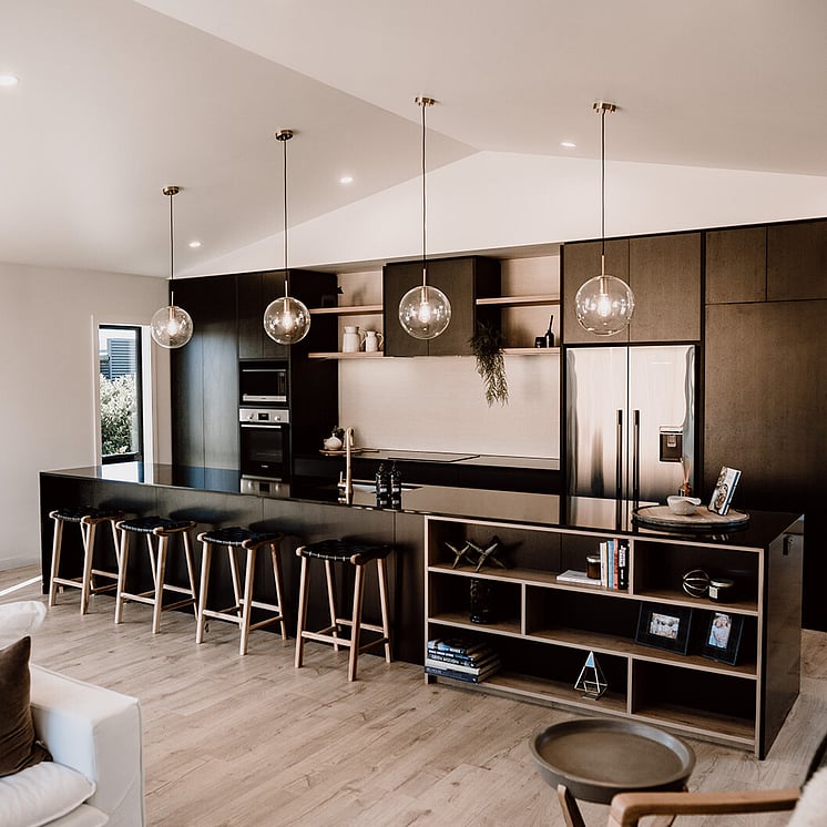 The highlight of the home is undoubtedly the striking black kitchen with matte finish soft touch acrylic cabinetry and timber-look open shelving and inbuilt bookcase. The black stainless-steel appliances, super sleek ebony extended benchtops with waterfall ends and brass tapware, brings sophistication to the hub of the home.