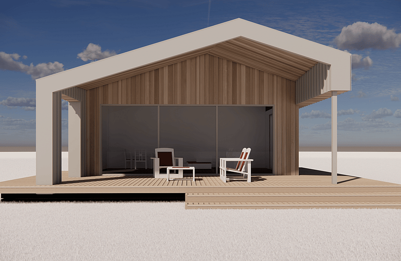 The design is defined by a folded roof form that wraps down to create a continuous outer shell. This simple form gives the building a clear, sculptural presence while also creating a sheltered outdoor living area that extends the usable living space for year-round use.