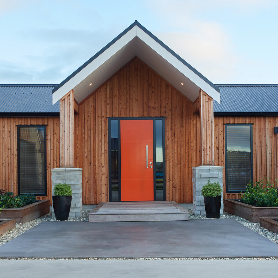The combination of Duralarch board and batten and stepped natural concrete block provide noteworthy texture and detail to the simple lines of this pod and link design.