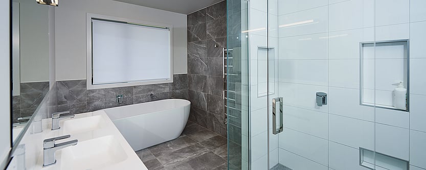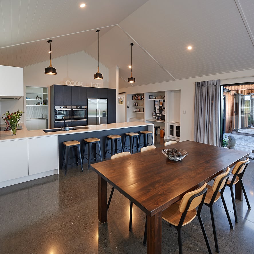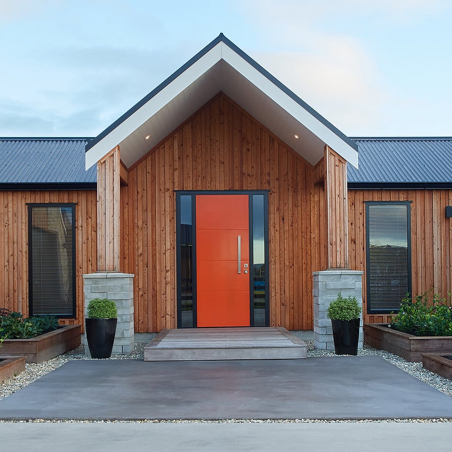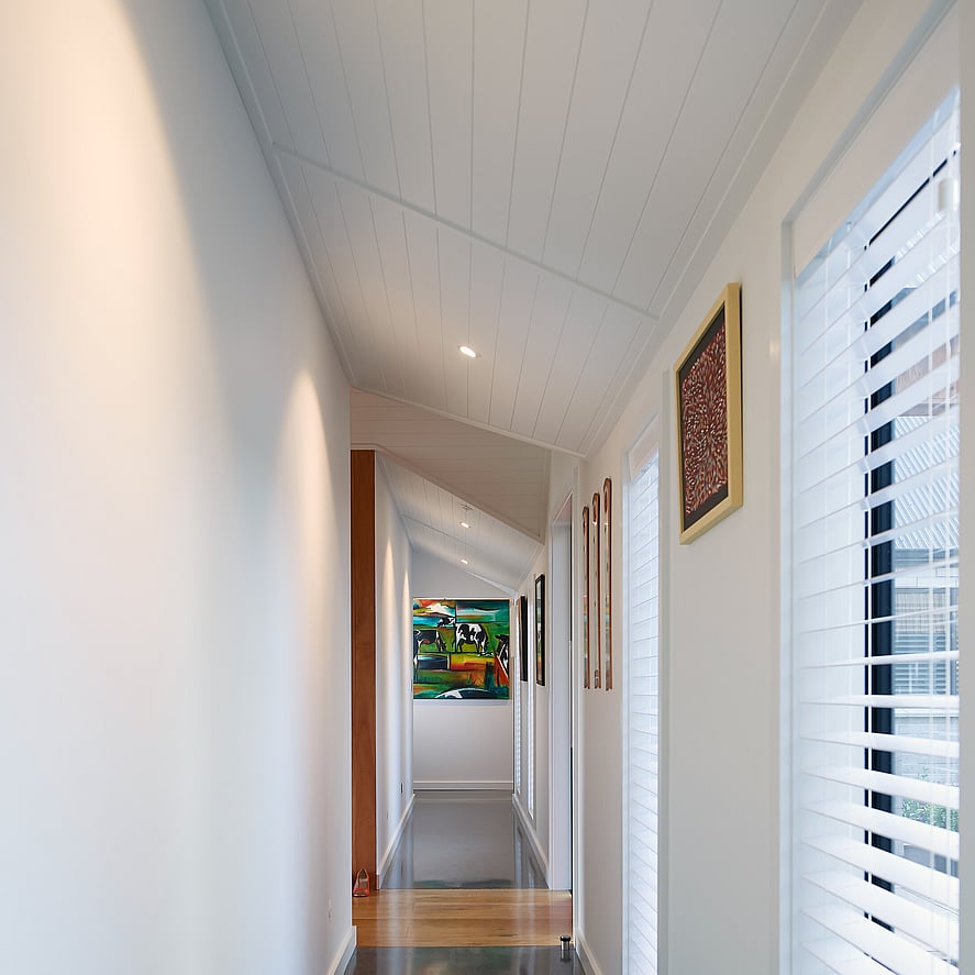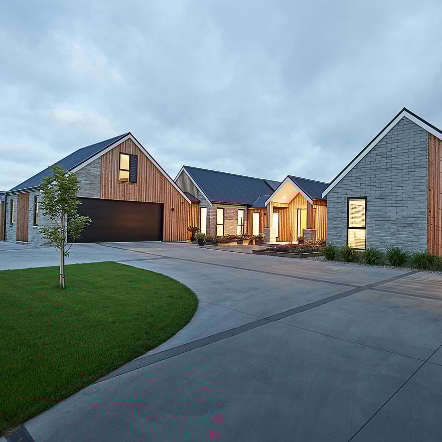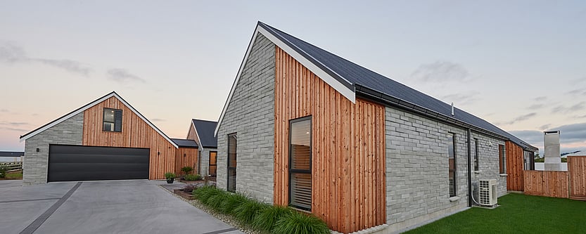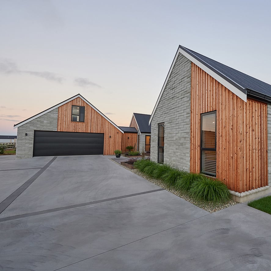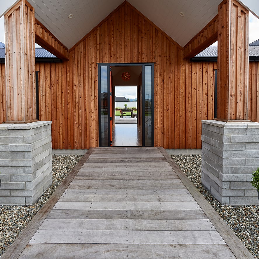 The combination of Duralarch board and batten and stepped natural concrete block provide noteworthy texture and detail to the simple lines of this pod and link design.