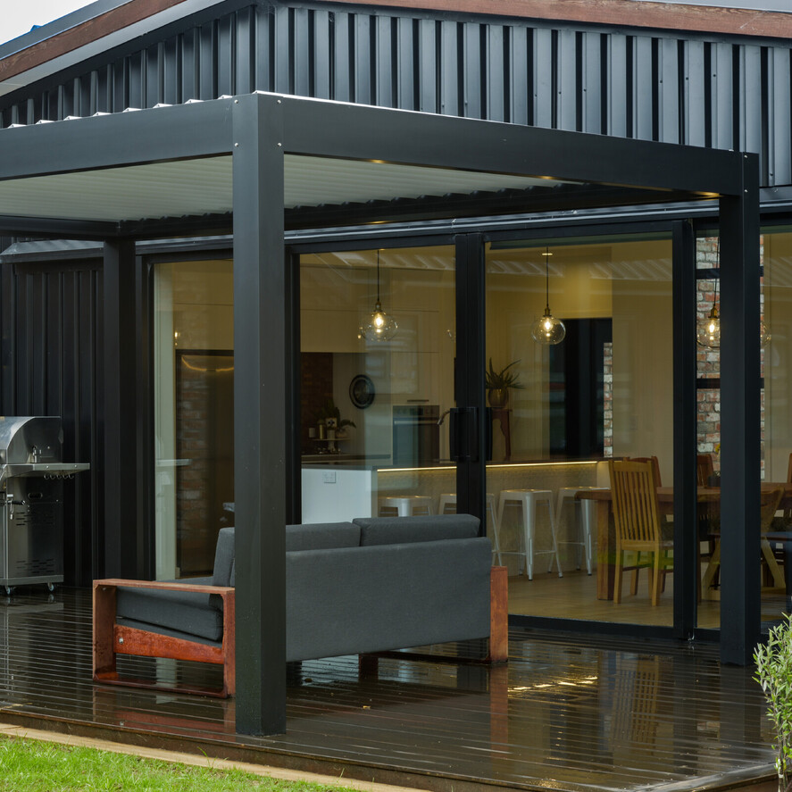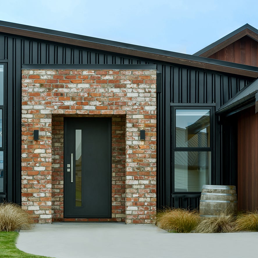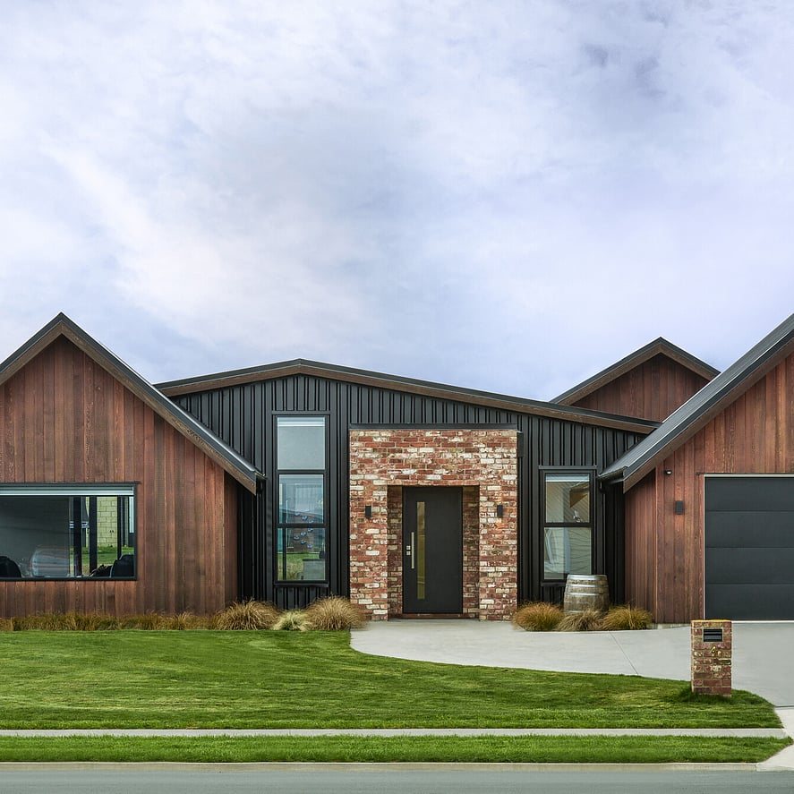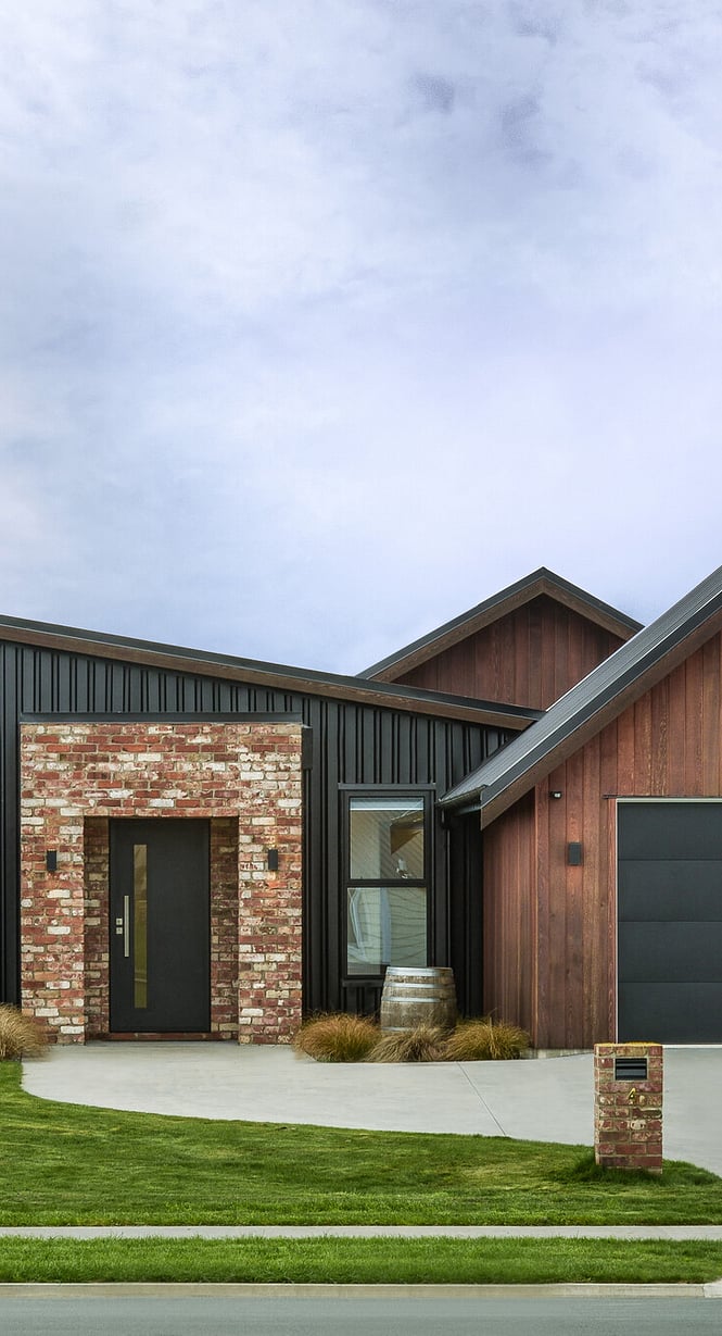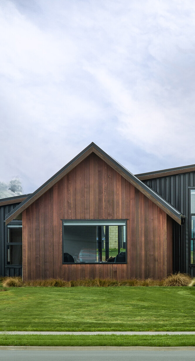 The vertical lines reflected across all elements of the exterior cladding draw the eye in - with vertically clad Shiplap cedar weatherboards set against black multi-rib steel.