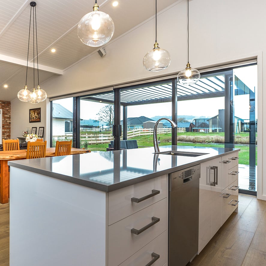 With a strong focus on sustainability and eco-friendly principles this impressive home uses a photo voltaic solar system providing electricity and careful glazing positioning for controlled solar gain. A large water tank also collects rain water for landscape irrigation.