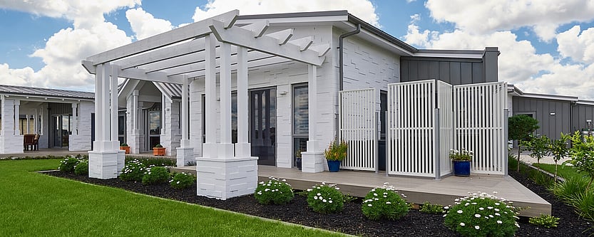 This contemporary classic home has a distinct lake house feel – with white stepped brick, cloud grey Eurostyle iron and nautical blue accents alongside maritime features of portholes and heavy white roping.