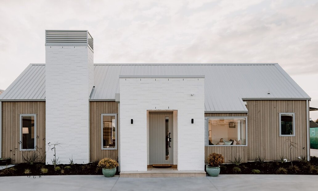 This stunning home exudes calm sophistication. The light hues of the stepped brick and vertical bandsaw cedar provide a softness against the clean, sharp exterior lines of this contemporary design.
