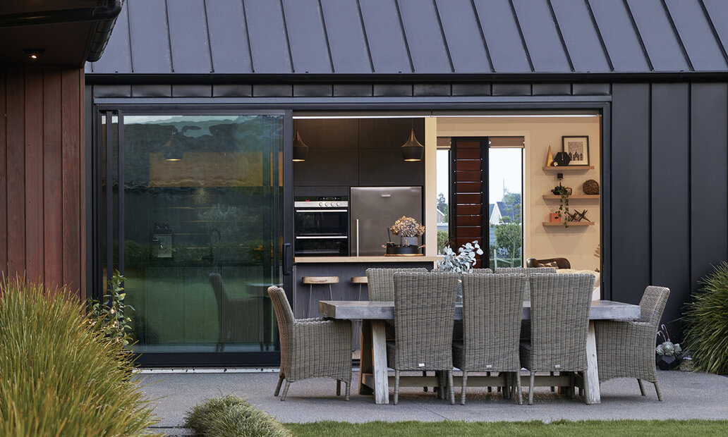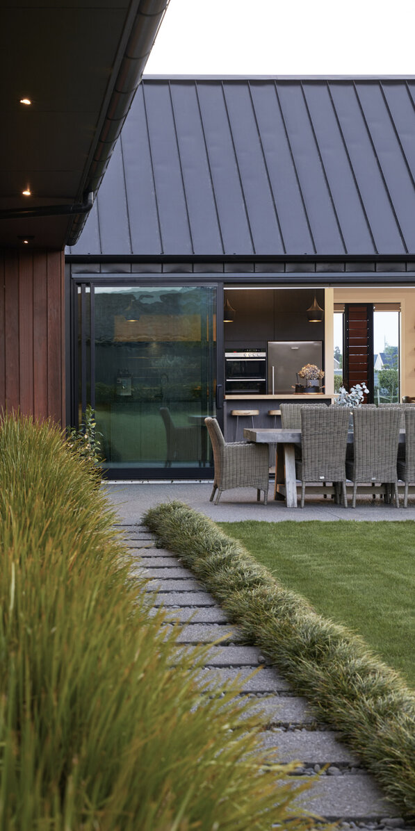 Black Eurostyle Iron was chosen as a current take on traditional board and batten cladding - with the standing seams meticulously aligned from roof to wall for a seamless continuity. And beautiful vertical cedar boarding provides an arresting contrast to the iron.