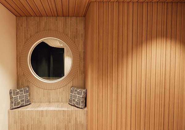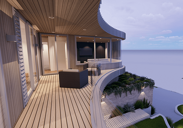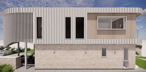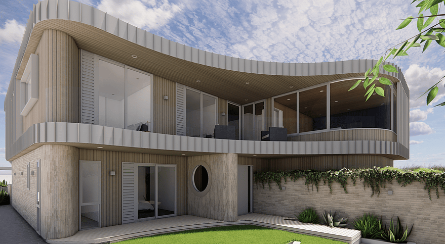 The design uses soft curved lines and layered forms to create a sculptural yet relaxed coastal presence. A restrained colour palette, and exterior materials of standing seam metal, curved brickwork and warm timber linings brings texture and warmth to the architecture. Large areas of glazing and the double height void create an airy, light-filled atmosphere, while timber ceilings and carefully proportioned spaces maintain a sense of comfort and intimacy throughout the home.