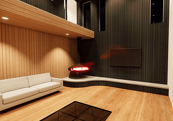 The ground floor forms the social heart of the home, where kitchen, dining and main living spaces flow together and open to a sheltered outdoor entertainment area featuring a pool, outdoor fireplace and a dramatic double height atrium. Vertical aluminium louvres span this space, gently curving along their lower edge to filter soft natural light into the interior while providing shading from the northern sun. The result is an outdoor room that feels both dramatic and intimate, creating a comfortable space for entertaining throughout the year. A guest bedroom with its own ensuite, along with a laundry and powder room, are also located on this level.