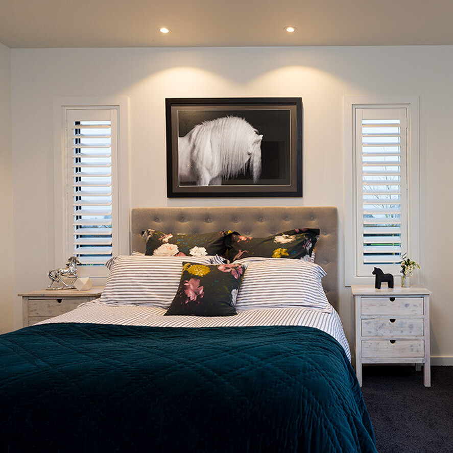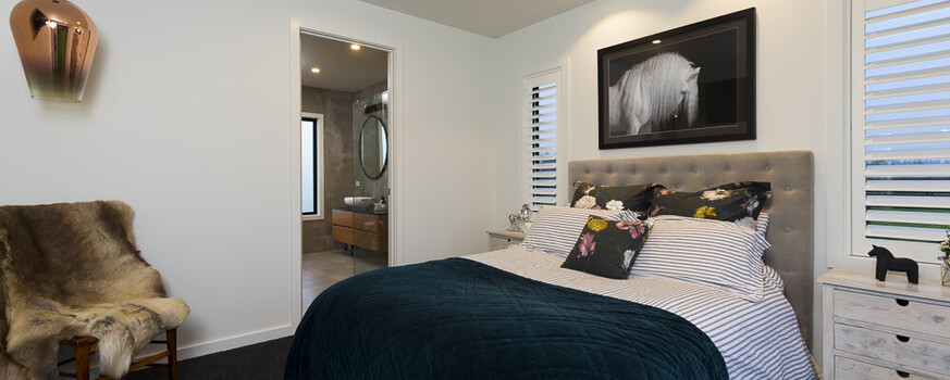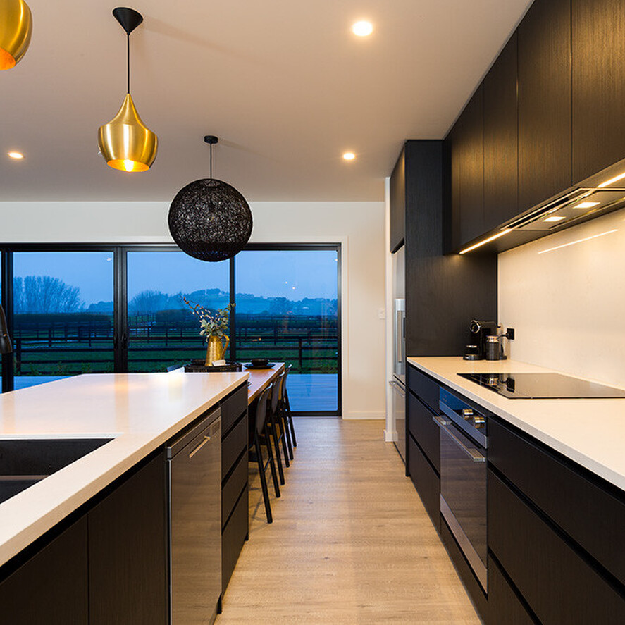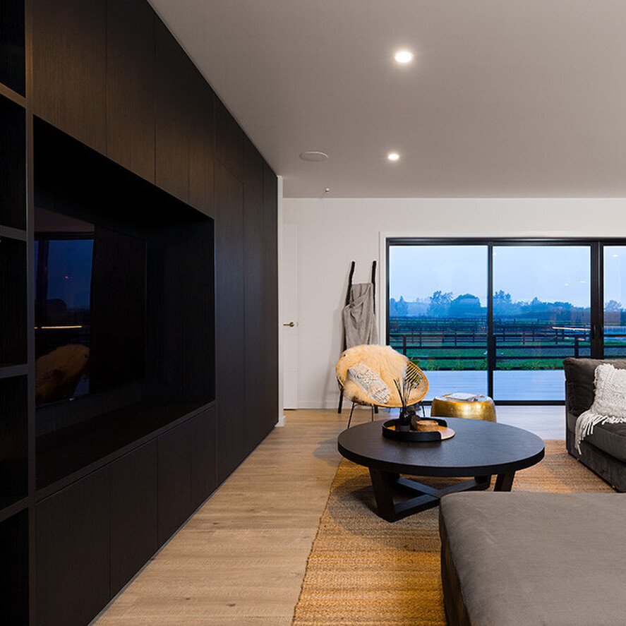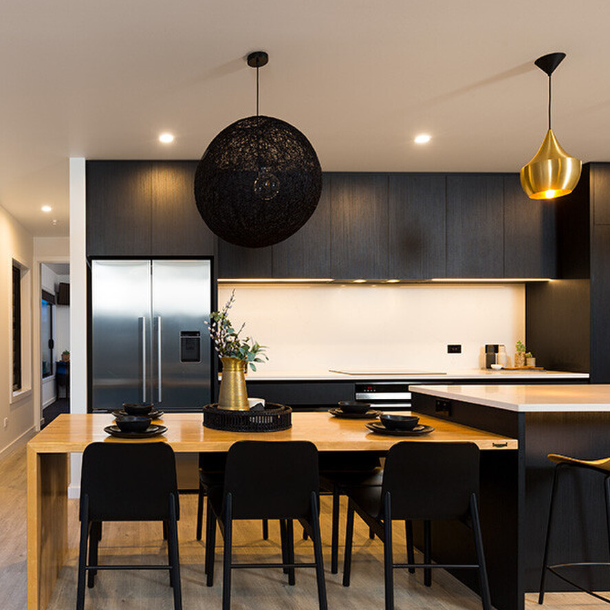 The striking ebony iron and manuka stained cedar exterior, complement our client's stunning selection of luxurious interiors. The kitchen, as the focal point of the main living area, is both smart and sophisticated with a solid timber American White Ash waterfall dining table, Primestone marble bench tops and black puregrain kitchen cabinetry.