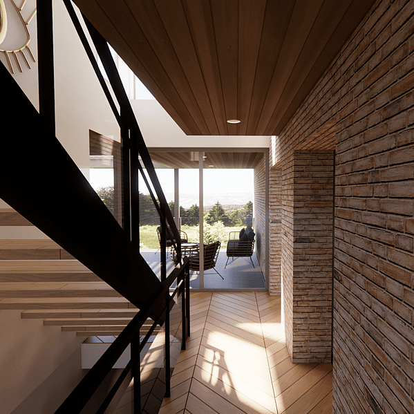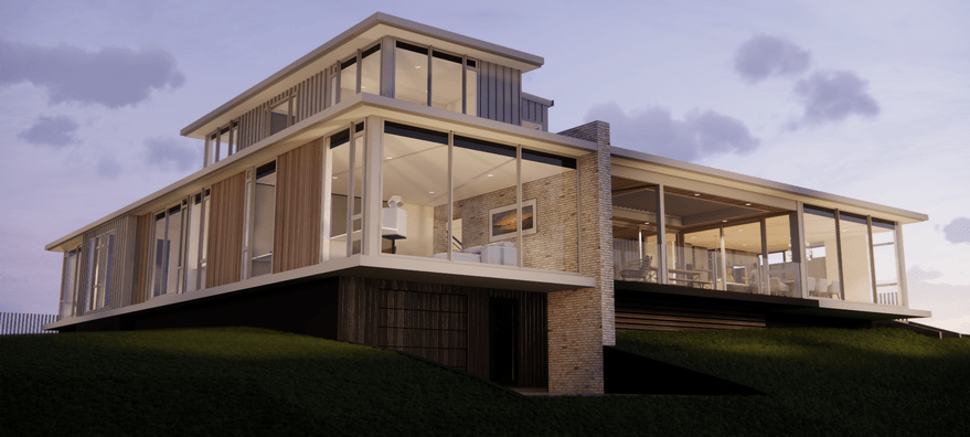 The brief was to design a contemporary retreat that facilitates easy entertaining while taking full advantage of the impressive 270-degree views from all levels of the home. Despite its multi-level structure and height, the house maintains a lean, low profile, allowing it to integrate seamlessly with its surroundings. The exterior features a blend of aged brick, Western Red Cedar and standing seam iron. Large floor-to-ceiling windows are strategically placed on the Northern elevation to make the most of the sun and capture the stunning vista of the Raglan estuary below.