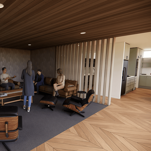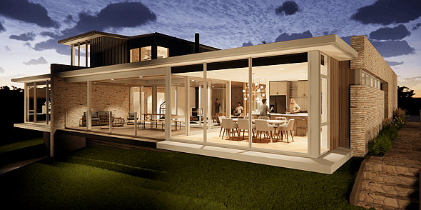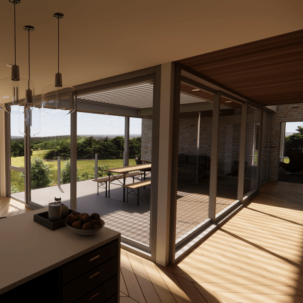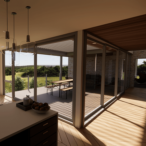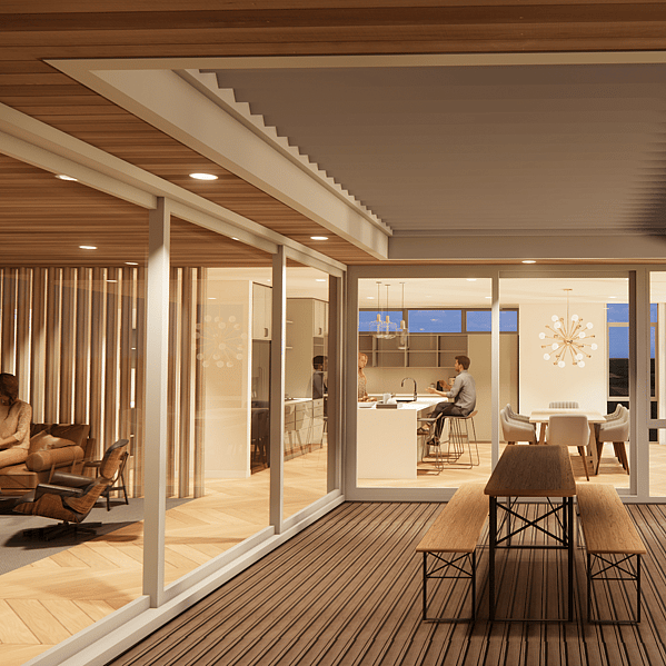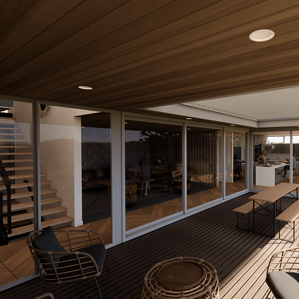 A standout feature of this home is the large recessed covered deck. This space allows residents and guests to spill out and soak in the views while being protected from the wind. The addition of an outdoor louvre ceiling not only adds architectural appeal but also provides further protection from the elements, ensuring comfort in all weather conditions.