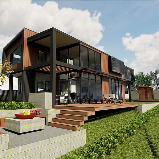 The contrasting vertical cedar against the black iron with accents of raw concrete blocks and plaster make an arresting combination but manage not to detract from the leafy surrounds.