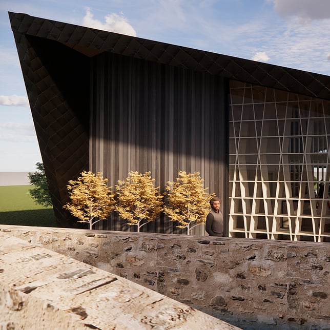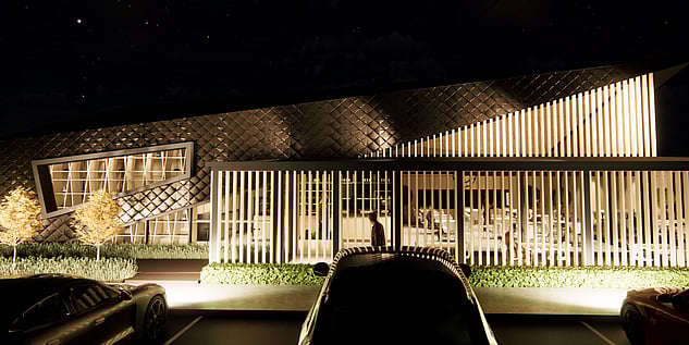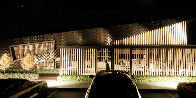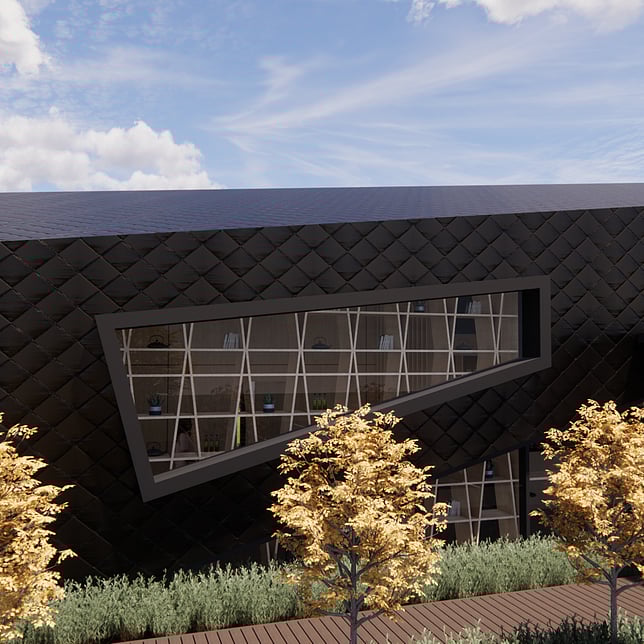 The result is a unique contemporary building clad in textured metal, glass and natural wood. The timber latticework is a stand out feature both inside and out, and is highly functional providing display shelving as well as shade and privacy.
