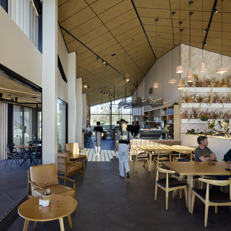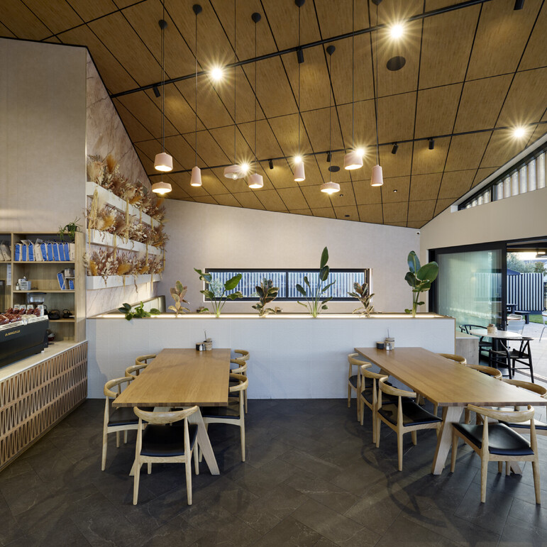 The café interior boasts a 235m2 floor area, providing ample room for patrons to relax and enjoy their dining experience. The space is light and airy due to the expansive glazing and a high, timber-tiled angled ceiling. Warmth has been added to the interior with the use of timber and a muted neutral colour scheme. Terracotta pendant lights hang in the atrium and a gentle-rust shaded marble feature wall, add to the warm and inviting atmosphere.