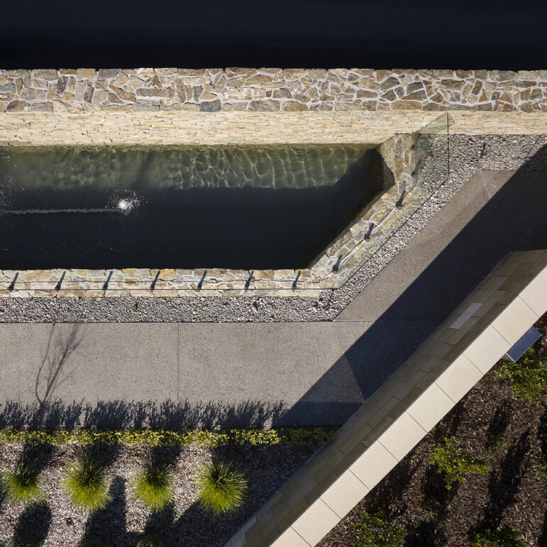 A unique part of the design is a beautiful arched schist bridge, accompanied by a waterway and fountains - also by Turner Road Architecture - which extend along the southern boundary and can be admired from the large angular window and also from the walkway that meanders between the bridge and the building.