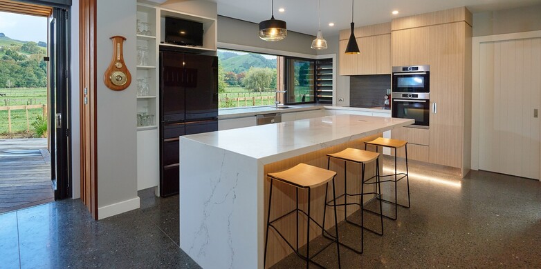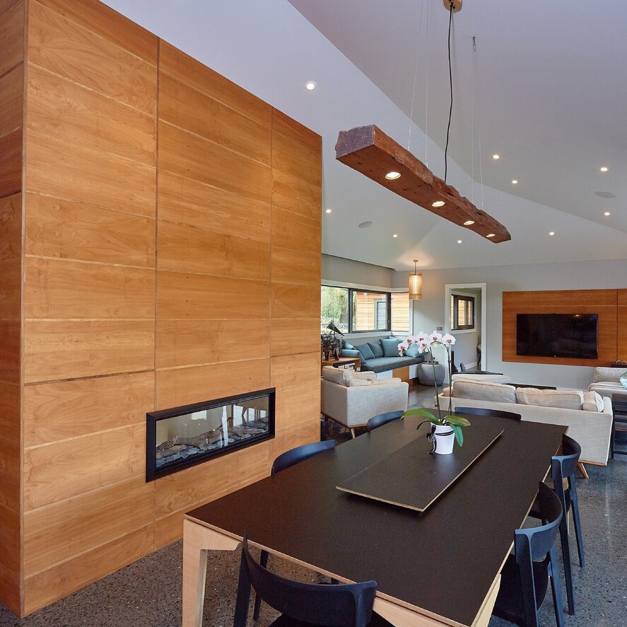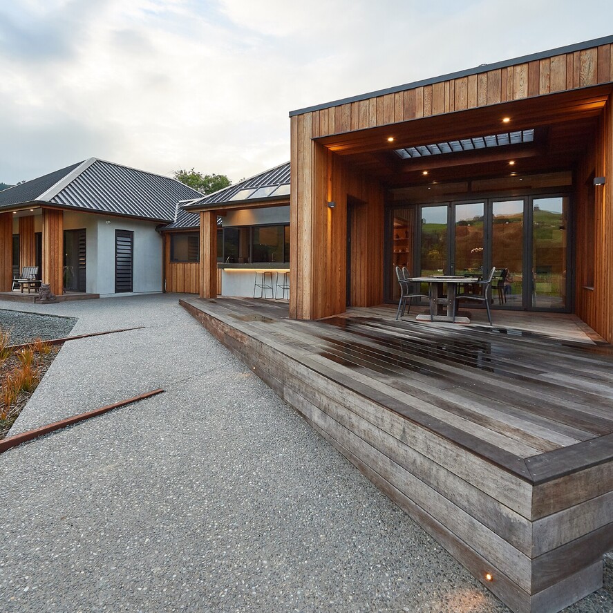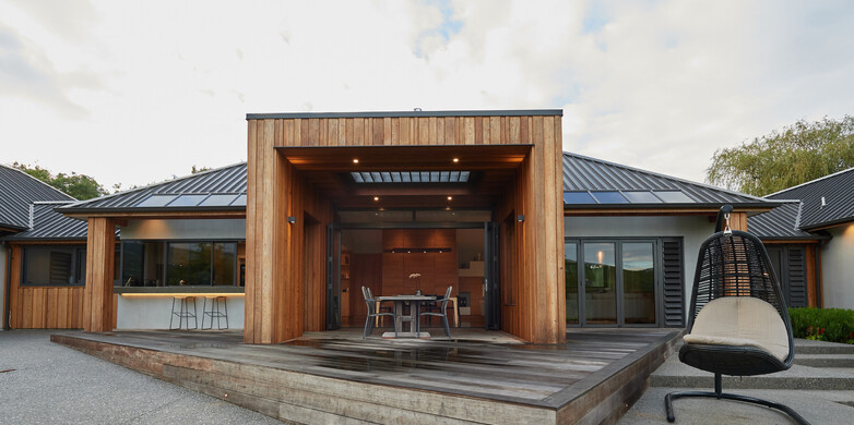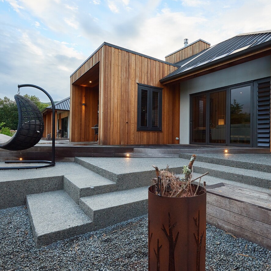 The dramatic tawa timber entrance wall is a stand out feature – it also serves as backdrop to the dining room and is mirrored in the living area with a tawa clad TV wall. The North facing outdoor entertainment area is a well-used and much loved focal point of the home with each area being thought out with purpose – from the all-weather semi-enclosed outdoor dining area, the casual BBQ spot with bar stools positioned directly along the large stacker kitchen window and a fire pit alcove nestled cozily in a sheltered corner.
