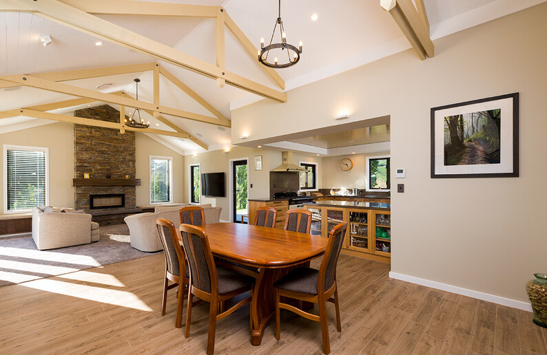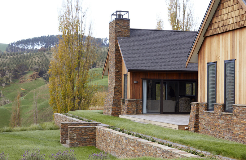 The site and surroundings inspired the selection of a natural material palette which included bandsawn cedar shiplap weatherboards and schist stone with cedar shingle detailing to the gable end walls. Substantial stone chimneys to the front and back of the home, multi-pitched shingle roofs and timber cladding are reminiscent of traditional pastoral buildings, albeit with a more modern profile.