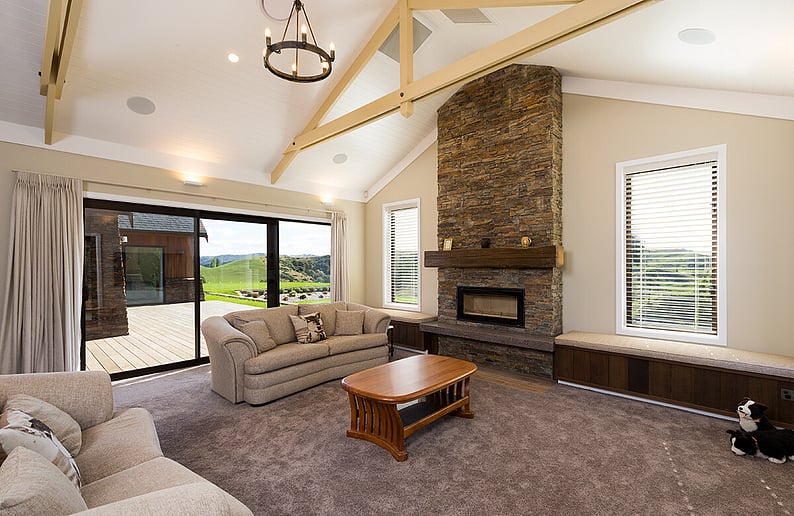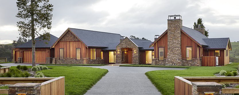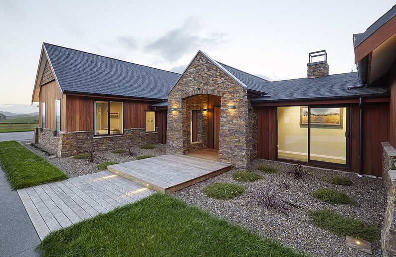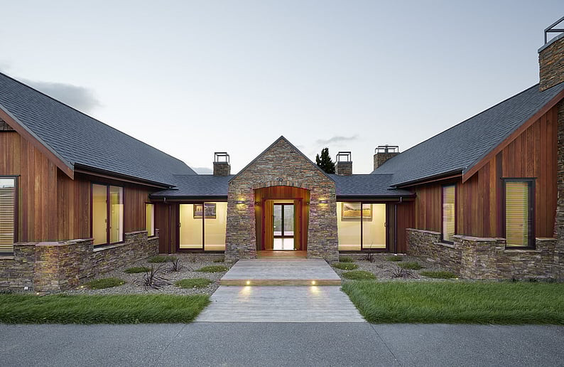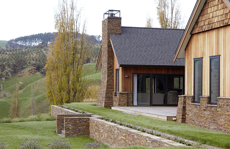 The site and surroundings inspired the selection of a natural material palette which included bandsawn cedar shiplap weatherboards and schist stone with cedar shingle detailing to the gable end walls. Substantial stone chimneys to the front and back of the home, multi-pitched shingle roofs and timber cladding are reminiscent of traditional pastoral buildings, albeit with a more modern profile.